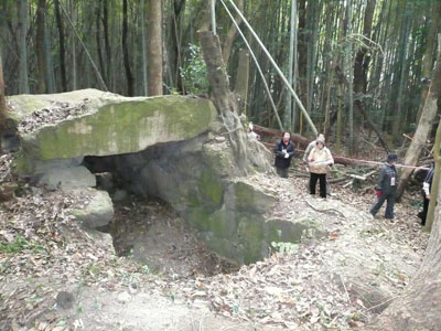 火の山古墳群を歩く参加者。 同古墳群は深い竹林の中に点在して います。巨大な古墳には、いったいど んな人物が埋葬されていたのか、ロ マンをかきたてられます。