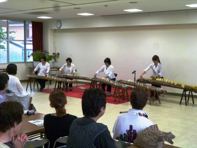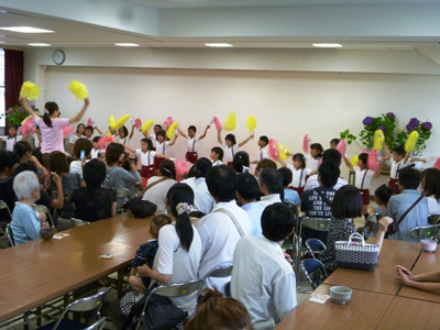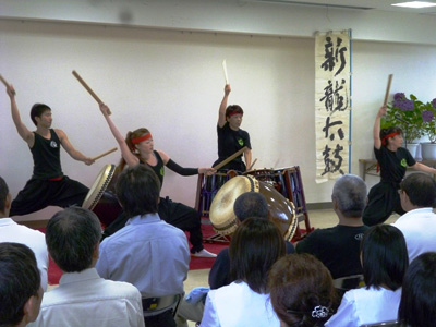 それでも会場内には200名もの来客が集まり、午前10時にあじさい祭りが開催。見野の郷交流館運営委員長を務める竹中隆一会長の開会の挨拶の後、たつの市から新龍太鼓の皆さんによる勇壮な和太鼓演奏、そして邦楽集団秋桜(コスモス)の皆さんによる、優美で繊細な琴の演奏を楽しみました。四郷中学校茶道部の皆さんからは美味しい抹茶がふるまわれ、また、四郷和光保育所の児童の皆さんによる「獅子の舞」に会場は大いに盛り上がりました。