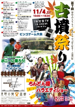 11月4日(日)に、第7回となる古墳祭りを開催します。今年も素晴らしいイベントになるよう、実行委員会及び見野の郷交流館職員一同、鋭意努力中ですので皆様のご支援、ご協力をお願いします。