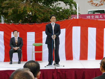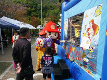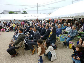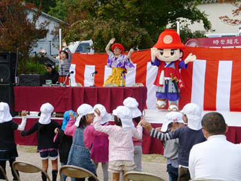 そして本祭となった3日(日)は曇空が広がるあいにくの天候でしたが、予定通り10時から古墳祭り実行委員長を務める竹中隆一会長が開会を宣言すると、四郷幼稚園と四郷和光保育所の児童約40名の皆さんが歌と演技を披露してくれました。すると会場に現れたしろまるひめ、そして黒田官兵衛イメージキャラクター「かんべえくん」と一緒に「かんべえくん体操」で体を温め、今年の古墳祭りの幕が開けました。