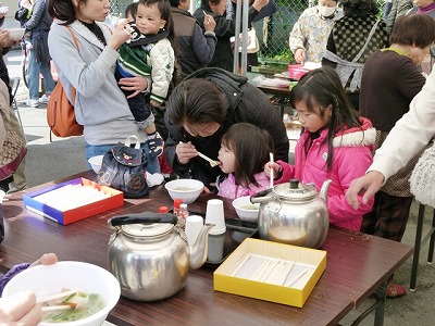 | ▲ 皮革製品の展示販売、革小物作りなどの体験コーナーが人気。温かい豚汁が振舞われました。 |