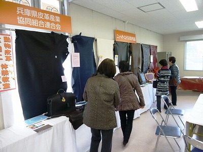 | ▲ 兵庫県皮革産業協同組合連合会からはニューレザーコンテスト2014作品展での受賞作品の数々が展示され、動物の小物作りなどのレザークラフト教室が人気。カレーライスや堀川町から出店でフランクフルトも振る舞われました。 |