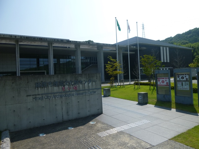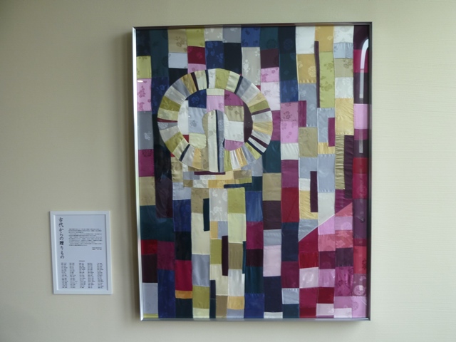 「古代からの贈りもの」と名づけられた色彩豊かな布は、当センター南側「宮山古墳」からの出土品で、国の重要文化財である銀錯貼金環頭大刀をモチーフにしています。1階のロビーから階段で登ったところに飾られています。これからも、姫路市埋蔵文化財センター『まい姫』は古代からの遺産を未来へと受け継ぐ重要な役割を担っていくことでしょう。