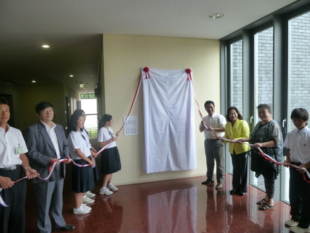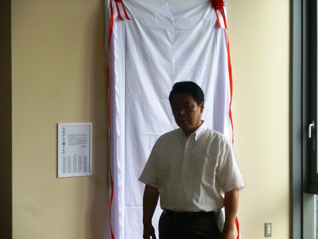 四郷地区連合自治会長である竹中隆一見野古墳群保存会会長の挨拶からはじまり、中杉隆夫教育長、竹中安美理事長、そして「ポシャギ」製作に関わっていただいた方々による除幕式を行いました。