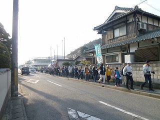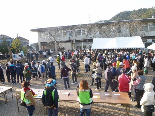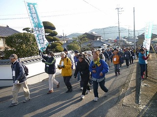 姫路古墳ロード歩こう会推進委員会委員長を務める竹中隆一市議会議員、西田 啓一市議会議員、黒川優副市長の挨拶から始まり、見野の郷交流館を出発しました。この日は、快晴で絶好のウォーキング日和でした。まず向かったのは、姫路市埋蔵文化財センターで、企画展「蕃神来臨~姫路の古代寺院~」を見たあと、印鐸神社から山道に入りました。途中、疲れた表情の方もおられましたが、「今年も来たよ!!」と元気に声をかけていただくなど皆さん順調にウォーキングを楽しまれていました。急な下り坂も、順番に並び歩いてもらうなど、マナーを守っていただいた結果、今回も大きなケガなく無事に開催することができました。見野の郷交流館において行われた「しごう冬のつどい」では、あったかい豚汁とおにぎりのおもてなし、「今市郷土芸能保存会、風(たつの市」の皆さんによる和太鼓ショーや、ビンゴゲーム大会でウォーキングの疲れを癒し、楽しんでいただきました。開催にあたりご協力いただきました各種団体の皆様、寒い中本当にありがとうございました。