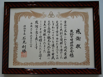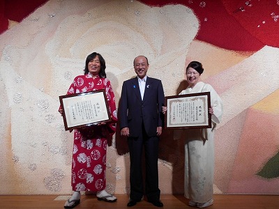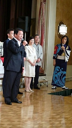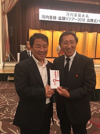 毎年、姫路市で開催されている「河内家菊水丸独演会」を皮切りに、河内家菊水丸師匠は河内音頭・盆踊りツアーに出られるため、6月24日(日)にシェラトン都ホテル大阪において盛大な出陣式が行われました。その際に「河内家菊水丸独演会」におけるグッズの収益金を、河内家菊水丸師匠の同席される中、竹中隆一見野古墳群保存会会長より、NPO法人遠野まごごろネット臼澤良一理事長に手渡されました。