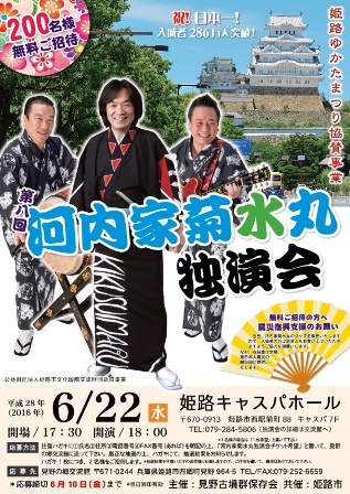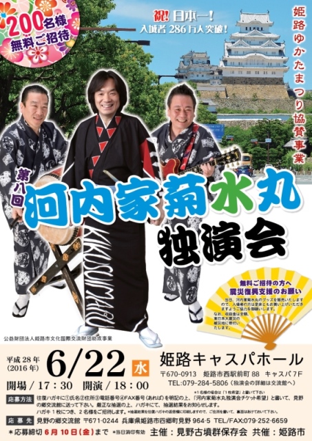 ゆかたまつりの夜に伝統河内音頭継承者河内家菊水丸が来姫し、独演会を開催します。本格的な河内音頭をじっくり聞けるまたとない機会です。今回、この河内家菊水丸独演会に抽選で200名様を無料で招待いたします。